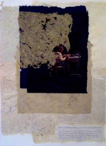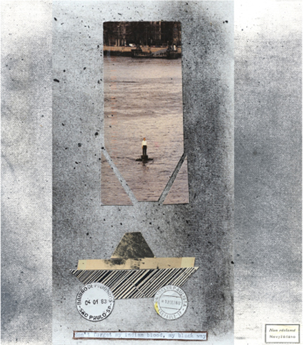 Barbara Bash, "GOING DOWN" Mi-Tiente canson paper, sumi ink, gouache, postcard and letter fragments, 13 x 18"