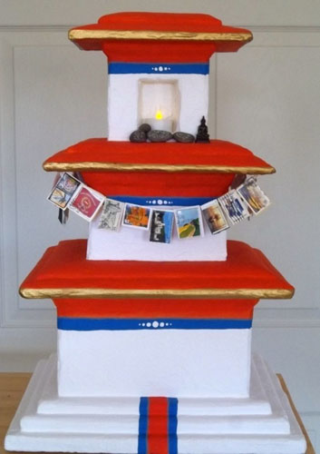Gurmi Lama, "CHORTEN (Monument)" polystyrene, reinforcing agent, mud, postage stamps, acrylic paint, base: 14 x 14", height: 21"