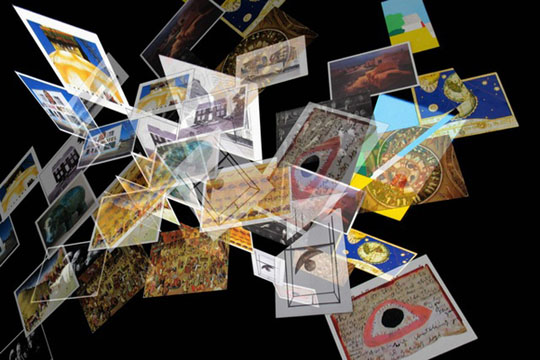 Agness Au, "DREAMSCAPE- 22 POSTCARDS, 4 STAMPS, A NOTE" assorted papers on canvas, 20 x 30"