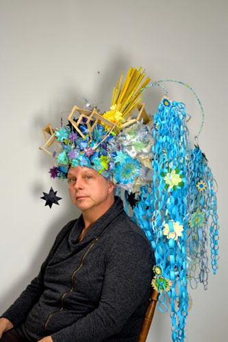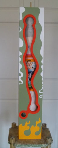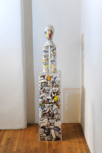 Steve Clorfeine, "LOGOS" paper mache, collage, paper, plastic containers, 6 x 6 x 24", base, 42" high