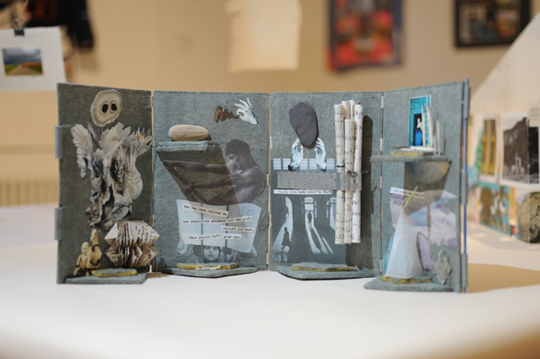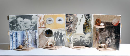 Leslie English, "VENTURING OUT" paper, stone, wood, metal, bone, quills, 6 x6 x 8.5 (closed); 8.5 x 22 (open)