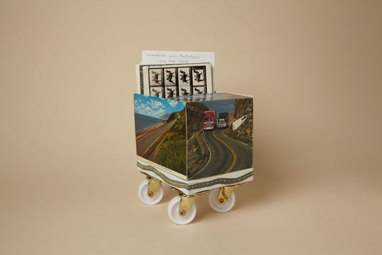 Andra Samelson, "POSTCART" postcards, plastic wheels, 6 in. w. x 10 in. h. x 6 in. l