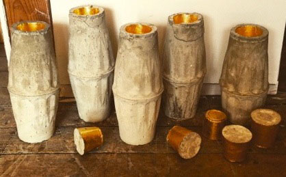 Elana Adler, “VESSELS” concrete, gold leaf, ashes from burned letters, 9.5 x 4 x 4"