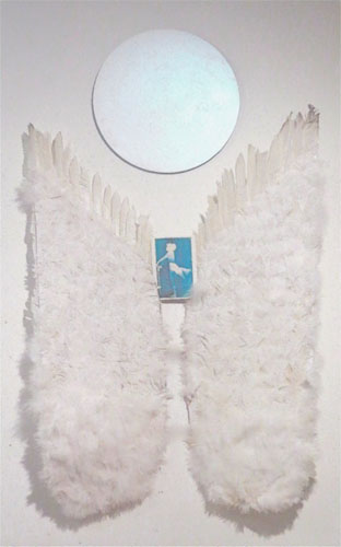 Jon D’Orazio, "WINGS OF LIGHT" postcard, feathers, acrylic, wood, 5 x 35 x 46"
