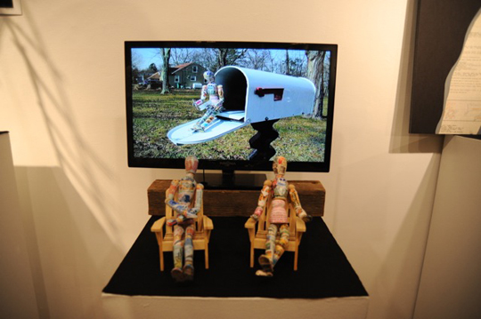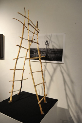 Roy Gumpel, "BEAVER STICK LADDERS/RT. 66 MAILBOX" beaver sticks, wire, letters, photograph, ladders: 15 x 36", print: 10 x 17"
