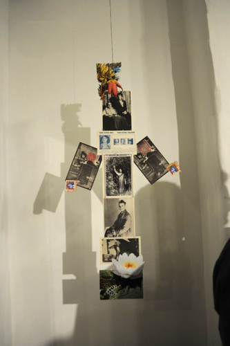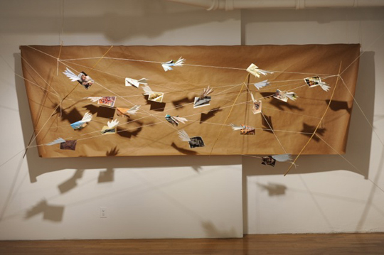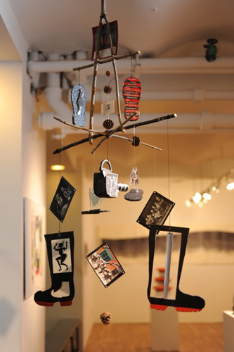 Jane Zipp, "UNTITLED" mobile, foam core, letters, postcards, branches, miscellany, 24 x 48"