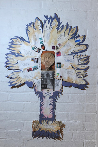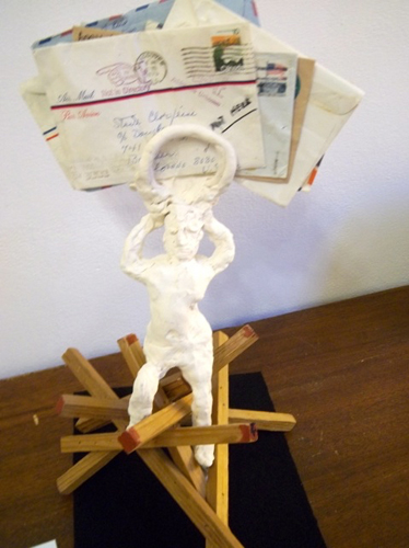 Steve Clorfeine, "LOGOS" detail. Paper mache, letters, envelopes, 24 in h. x 8 in w. x 8 in deep