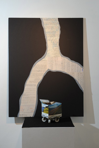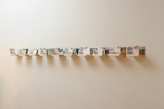 Andra Samelson, "POSTCART" plywood, postcards, plastic wheels, 5 x 6 x 7", base: black foam core, letters, acrylic paint, 30 x 40"