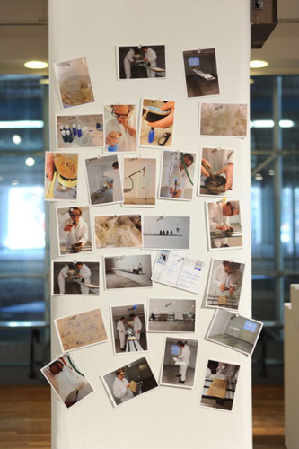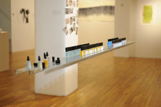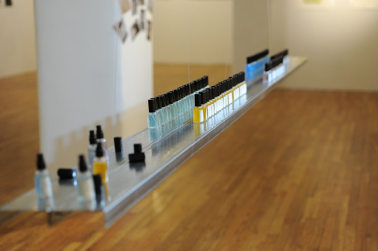 Wilma Vesseur and Marcel Ruygrok, "SCENTS SENT" installation- perfume bottles, containers, aluminum plank, substance, 6 x 78"