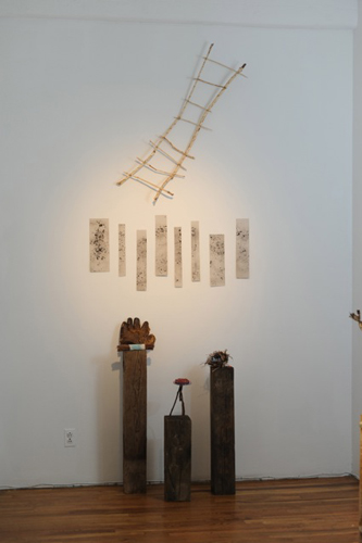 Steve Clorfeine, "WHAT CORRESPONDS TO WHAT" ash drawings, old 4 x 4's, wild sumac, Susan Banyas' bird nest, Roy Gumpel's beaver wood ladder, my father's baseball glove (1925), I Ching sticks collected by David Appelbaum