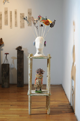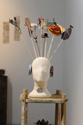Steve Clorfeine, "MIND NO MATTER" paper mache, collage, sticks, pins, dog tag, Mexican warrior, 6 x 6 x 26"