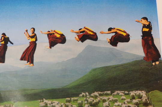 Claire Rosenfeld, "LEAPING MONK/SHEEP" collage, 13 x 16"
