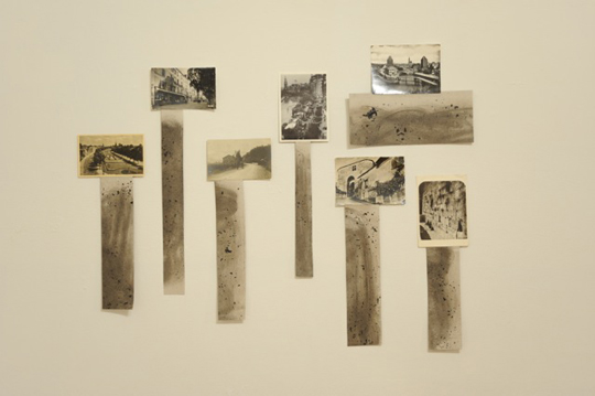 Steve Clorfeine, "FAMILIAR PLACES" ash on 1938 photograph cover, b&w postcards