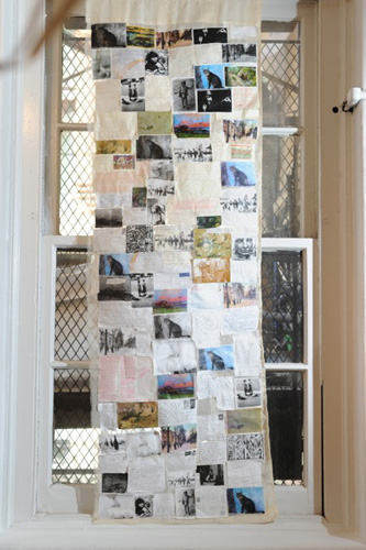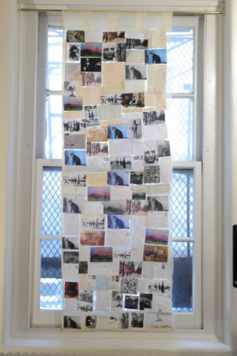 Connie Steckel, "CORRESPONDENCE CURTAINS" nylon, photocopied postcards, stitching, 27x83"